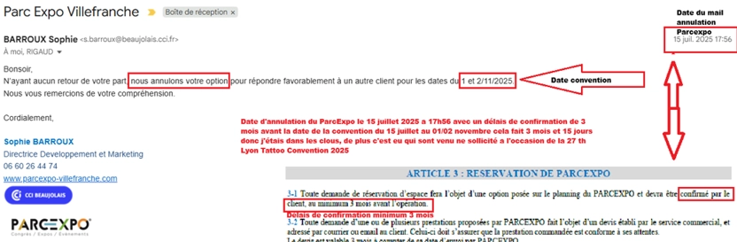 Je souligne également que le projet d’organisation au Parc-expo est né de votre propre sollicitation, lors de la 27th Lyon Tattoo Convention au Double Mixte, où vos représentants m’ont expressément proposé d’accueillir mes événements don la 28th édition de la Lyon Tattoo 2026 dans vos locaux.